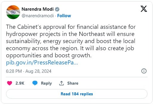 केंद्रीय मंत्रिमंडल ने पूर्वोत्तर क्षेत्र में जल विद्युत परियोजनाओं के विकास के लिए पूर्वोत्तर क्षेत्र की राज्य सरकारों द्वारा इक्विटी भागीदारी के लिए केंद्रीय वित्तीय सहायता को मंजूरी दी