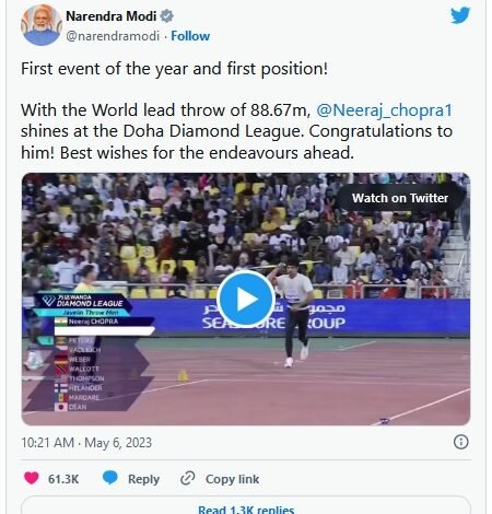 प्रधानमंत्री ने ट्वीट किया: “वर्ष की पहली प्रतियोगिता और पहला स्थान! 88.67 मीटर की वर्ल्ड लीड थ्रो के साथ नीरज चोपड़ा का दोहा डायमंड लीग में शानदार प्रदर्शन। उन्हें बधाई! आगे के प्रयासों के लिए शुभकामनाएं।”