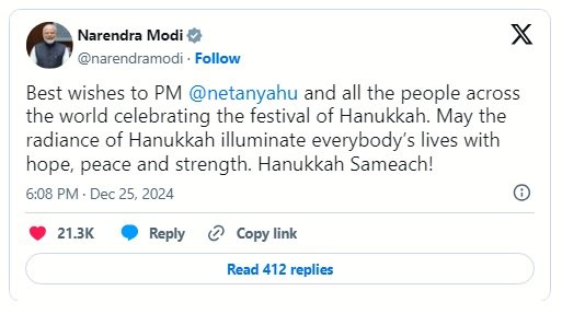 ऑनलाइन डेस्क, 25 दिसंबर 2024: प्रधानमंत्री श्री नरेन्द्र मोदी ने इजराइल के प्रधानमंत्री बेंजामिन नेतन्याहू और दुनिया भर में हनुक्काह त्यौहार मनाने वाले सभी लोगों को शुभकामनाएं दी हैं।