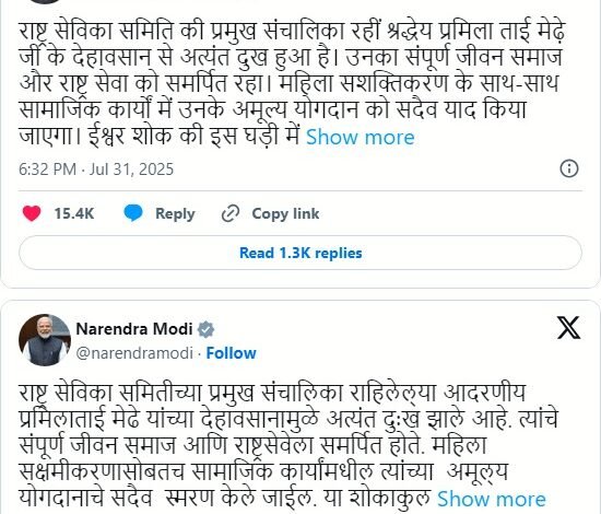 उन्होंने एक्स पर लिखी पोस्ट में कहा,“राष्ट्र सेविका समिति की प्रमुख संचालिका रहीं श्रद्धेय प्रमिला ताई मेढ़े जी के देहावसान से अत्यंत दुख हुआ है। उनका संपूर्ण जीवन समाज और राष्ट्र सेवा को समर्पित रहा। महिला सशक्तिकरण के साथ-साथ सामाजिक कार्यों में उनके अमूल्य योगदान को सदैव याद किया जाएगा। ईश्वर शोक की इस घड़ी में उनके परिजनों और प्रशंसकों को संबल प्रदान करे। ओम शांति!”