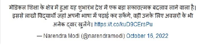 उन्होंने आगे कहा कि यह छात्रों के लिए अवसरों के विभिन्न द्वार खोलेगा। गृह मंत्री श्री अमित शाह के एक ट्वीट को साझा करते हुए प्रधानमंत्री ने ट्वीट किया: “चिकित्सा शिक्षा के क्षेत्र में यह लॉन्च देश में एक बड़ा सकारात्मक बदलाव लाने वाला है। इससे लाखों छात्रों के लिए अवसरों के कई द्वार खुलेंगे, जबकि वे अपनी भाषा में अध्ययन कर सकेंगे।