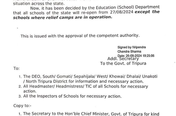 बाढ़ के कारण राज्य में स्कूल 21 अगस्त से बंद हैं। अब स्थिति सामान्य होने पर स्कूलों को खोलने का निर्णय लिया गया है। हालांकि, 24 घंटे पहले उन्होंने प्रेस कॉन्फ्रेंस कर दावा किया था कि स्कूल खोलने पर अभी अंतिम फैसला नहीं लिया गया है।