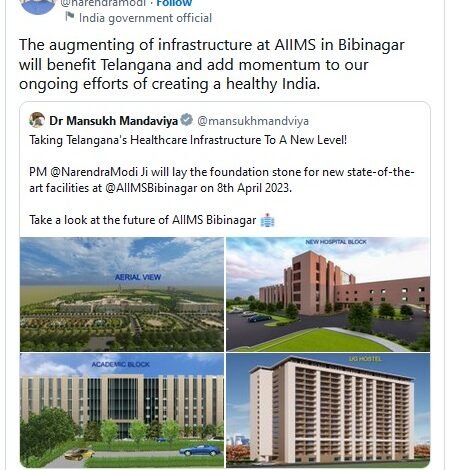 “बीबीनगर में अखिल भारतीय आयुर्विज्ञान संस्थान-एम्स में आधारभूत अवसंरचना में वृद्धि से तेलंगाना को लाभ प्राप्त होगा और स्वस्थ भारत बनाने के हमारे चल रहे प्रयासों में तेज़ी आएगी।”
